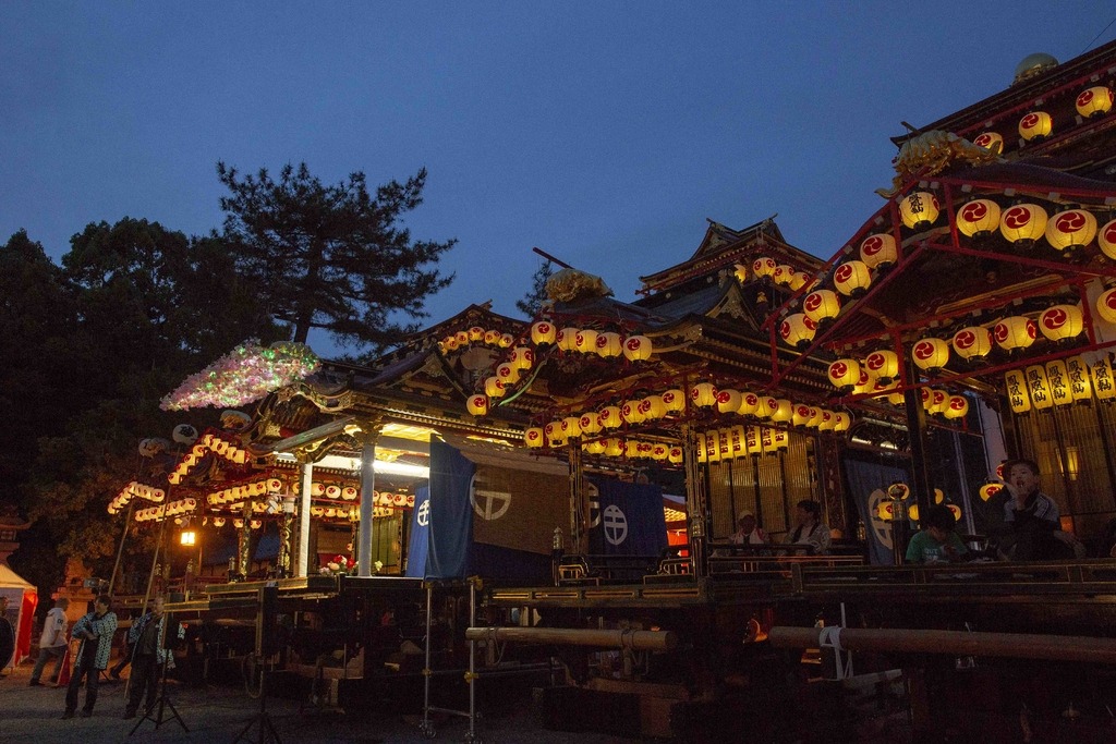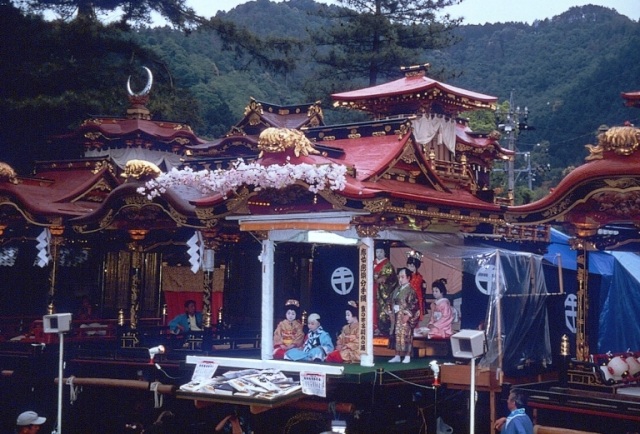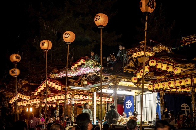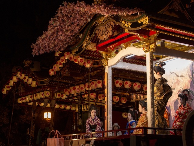 豪華絢欄な五輌の芸やまの曳き揃えと子ども歌舞伎