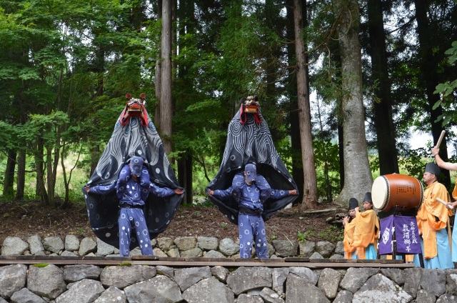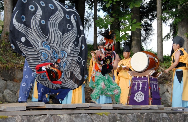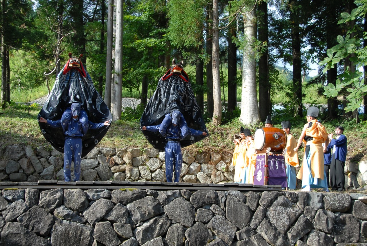 美しい白樺林と北アルプスの眺望がすばらしい数河高原。この高原に秋風が吹き始め、まわりの田んぼが実った稲穂で黄金色に染まる9月、飛騨市古川町上数河の白山神社、下数河の松尾白山神社の氏子たちが集まって秋祭りを祝います。その年の豊穣への感謝をこめて、古くからの神事である獅子舞を奉納する――これが岐阜県の重要無形民俗文化財にも指定されている「数河獅子」です。数河獅子は「曲獅子」「天狗獅子」「金蔵獅子」の三段から構成され、ユニークで独特な踊りを舞います。祭礼の1ヶ月前から村の古老が毎晩出演者の指導にあたり、その伝統を今に継承してきた歴史ある例祭です。