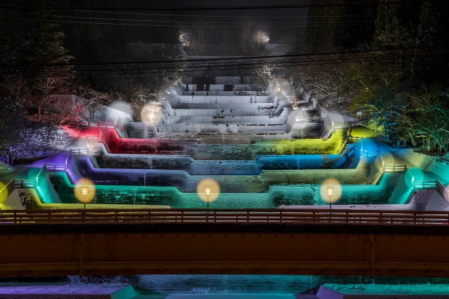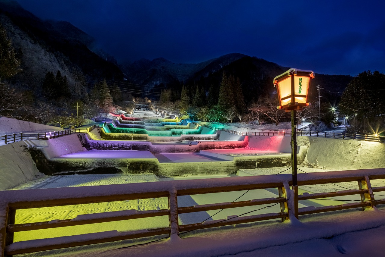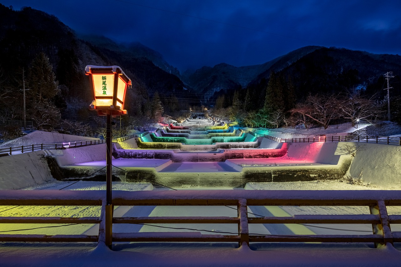 春の桜の名所 栃尾温泉「洞谷」の雪景色をLEDで鮮やかにライトアップ。まるで満開の桜を見るようです。イルミネーションを楽しんだ後は公共露天風呂「荒神の湯」にもお立ち寄りください。