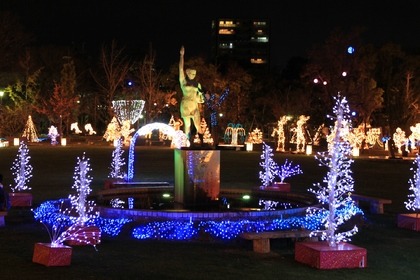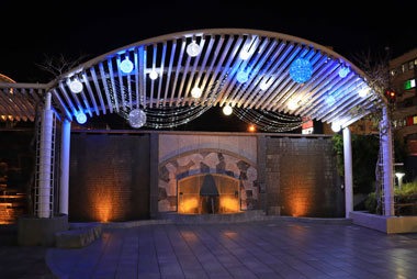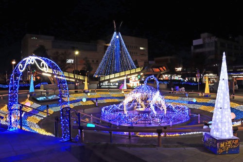 城下町大垣イルミネーション」は、大垣駅南街区広場をメインに、噴水を中心に水の都大垣らしい水をイメージした光の空間が演出されます。大垣駅、大垣駅通り、水門川新大橋などもさまざまなイルミネーションが街路樹などに装飾されます。