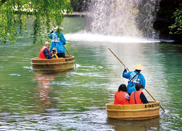 新緑を眺めながらのゆったりとした川下りは格別です。(距離:約1.1km、所要時間約30分)