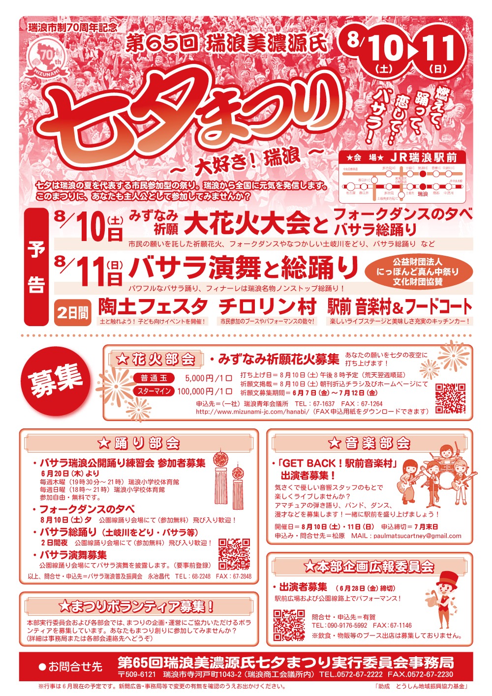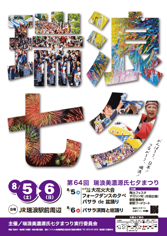 瑞浪美濃源氏七夕まつり(みずなみみのげんじたなばたまつり) まちがステージ!主役は私! 第66回瑞浪美濃源氏七夕まつり開催決定!!開催日:令和7年8月9日(土)、10日(日)瑞浪美濃源氏七夕まつりは瑞浪の夏を代表する市民参加型のお祭りです。8月9日(土)、10日(日)の2日間、 イベントがもりだくさん!!↓↓↓昨年のチラシです瑞浪の夏をアツく盛り上げます! エリア 東濃 瑞浪市 カテゴリー 花火 祭り・伝統行事 Loading... フォトツアーを見る 基本情報 開催期間 2025年8月9日(土)~8月10日(日) 開催場所 JR瑞浪駅前 住所 〒509-6121 岐阜県瑞浪市寺河戸町 電話番号 0572-67-2222 問い合わせ先 瑞浪美濃源氏七夕まつり実行委員会 アクセス JR中央本線瑞浪駅下車すぐ 中央自動車道瑞浪ICより車で約5分 駐車場(大型バス) 瑞浪市民公園いこいの広場 駐車場(普通自動車) 瑞浪市民公園いこいの広場 瑞浪中央公園 ウェブサイト バサラ踊り演舞日程