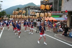 「お練り」というあんどん車を先頭に威勢のいい「厳立太鼓」とちょうちん行列に続いて8人が扮する「八神将」が乗る赤仁王、青仁王の2台の御輿を、さらしを巻いた裸の若衆が担いで市街地を練り歩きます。