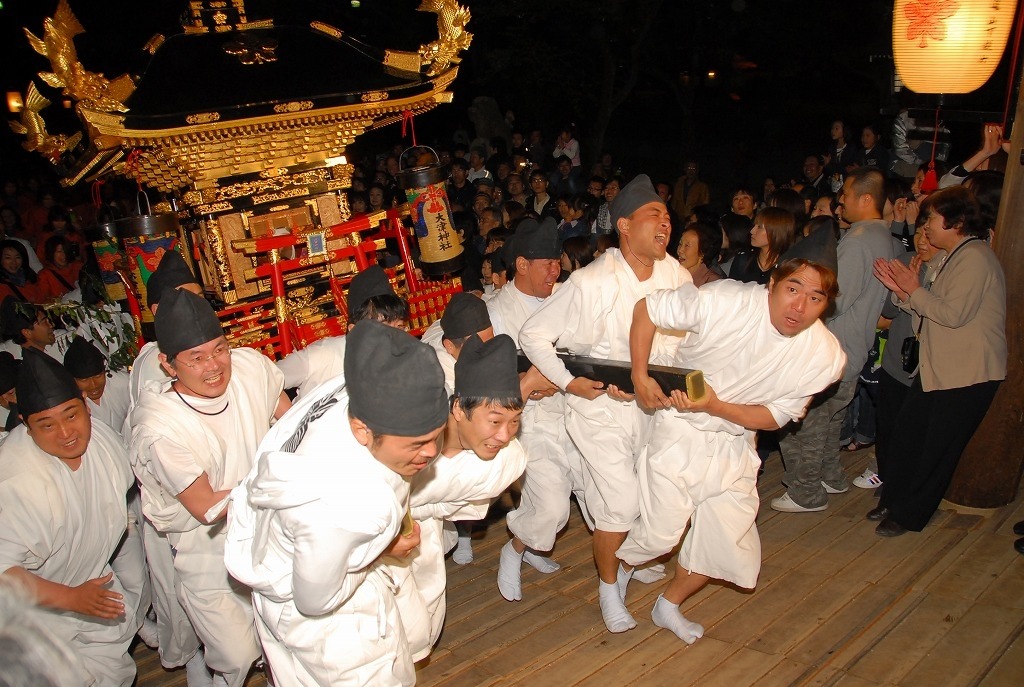 各神輿は、参道を行きつ戻りつゆっくりと練り進みますが、参道を登りきり境内にさしかかるとそれまでの足取りから一転、鶏闘楽の鉦が打ち鳴らされる中境内を一気に駆け抜けて拝殿へとなだれ込みます。熱気あふれる祭りのクライマックスは、観光客のみならず地元の人たちをも魅了します。