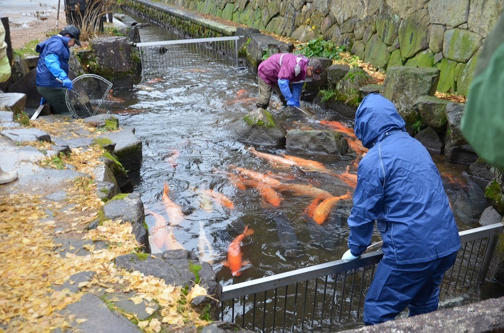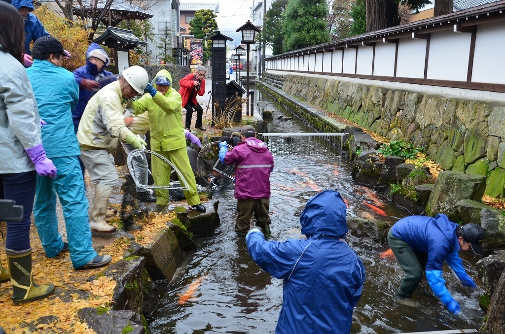 飛騨古川に、もうすぐ冬が訪れます。各家庭でも家の雪囲いをしたり、漬物を漬けたり、畑を片づけたりと冬支度が始まります。飛騨古川の人気スポット「瀬戸川と白壁土蔵街」でも冬の準備が行われます。夏場1,000匹の鯉が悠々と泳ぐ瀬戸川は、冬の間は除雪した雪を流すための「流雪溝(りゅうせつこう)」として使われるため、鯉を瀬戸川から近くの天神池(増島城の堀池です。)へ避難する作業(引越し作業)が行われます。毎年、11月の第4土曜日か日曜日に行われています。そして、来年4月まで天神池で越冬し、元気に瀬戸川に戻ってきます。夏の間、観光客、市民に愛され、大きく育った鯉の引越しは、中々の重労働です。1匹ずつ玉網ですくい、軽トラに乗せ、天神池に運搬されます。そして、飛騨市観光協会が考案した「安全滑り台」で天神の池に次々とダイビングします。来年の春まで瀬戸川の鯉は、見納めとなります。