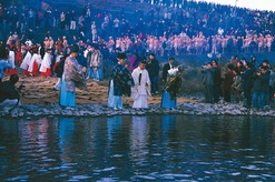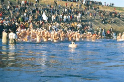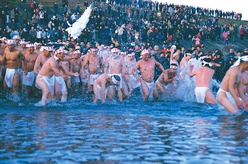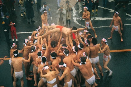 池ノ上裸祭としても知られるように、はちまきにふんどし姿の裸男たちが、寒風吹きすさぶ長良川に入りみそぎを行います。