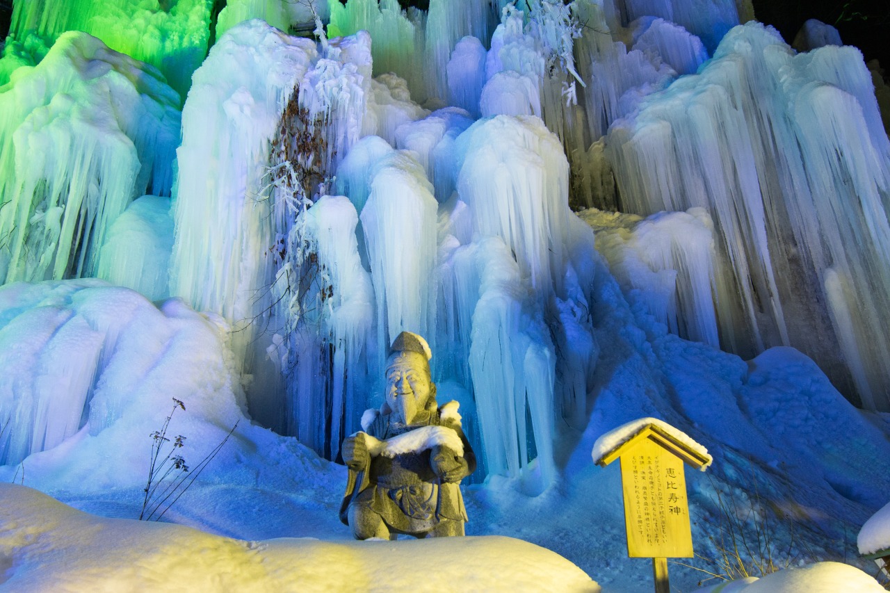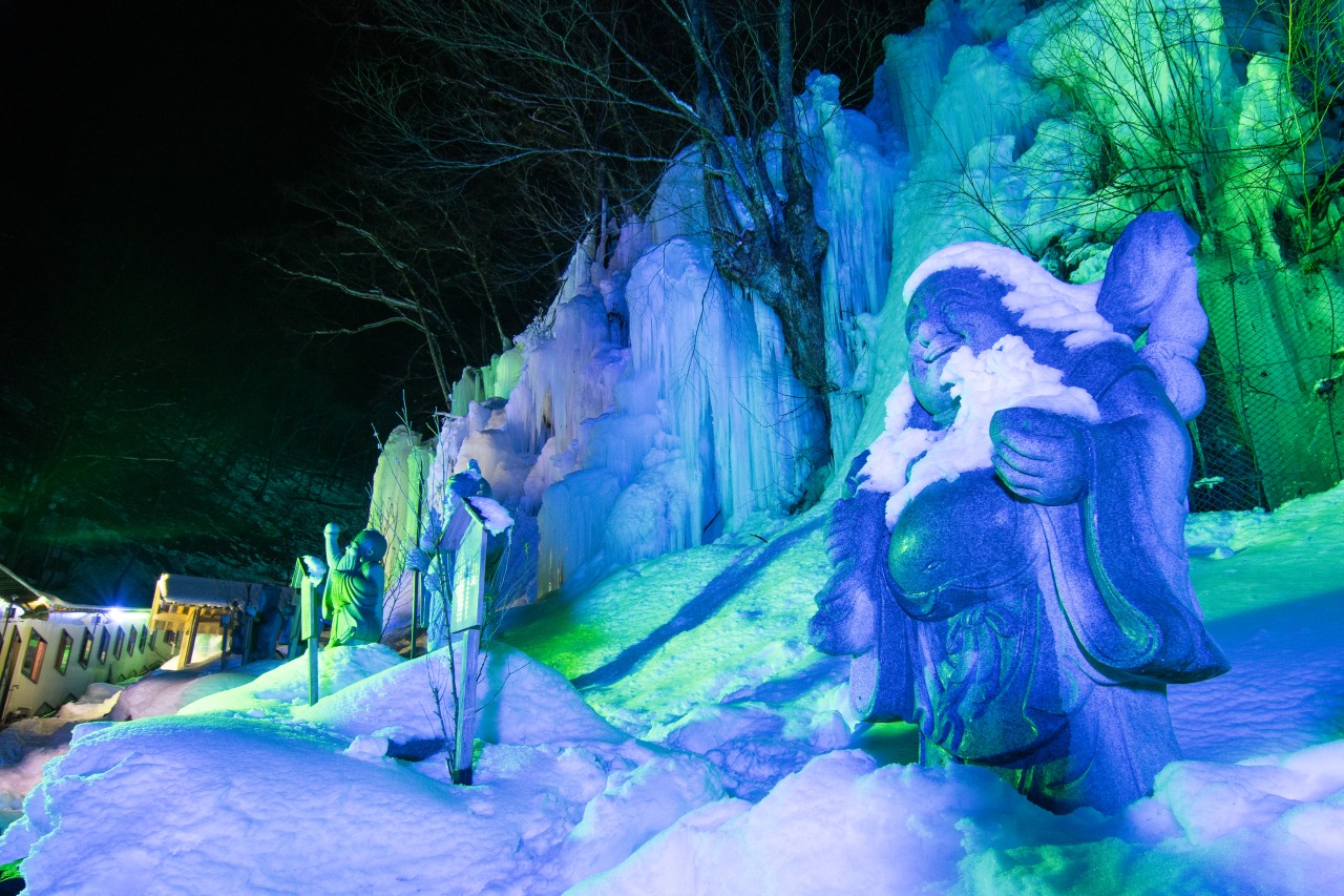 飛騨大鍾乳洞施設の山の斜面が、高さ最大30m、幅300mの青白い氷に覆われます。2月毎週土曜日にはライトアップも行います(日没から20:00まで)。冬期限定の氷の渓谷にぜひお越しください。