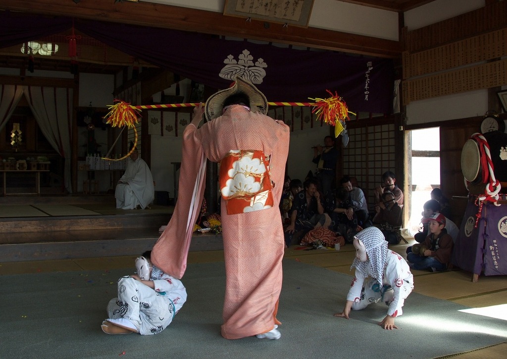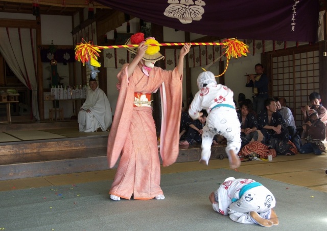 おかめに変装した女神が弓に好物の餌を下げて舞えば、子狐が戯れながら周りを飛び回り、逆立ち・宙返り・空中転回の曲芸を演じます。