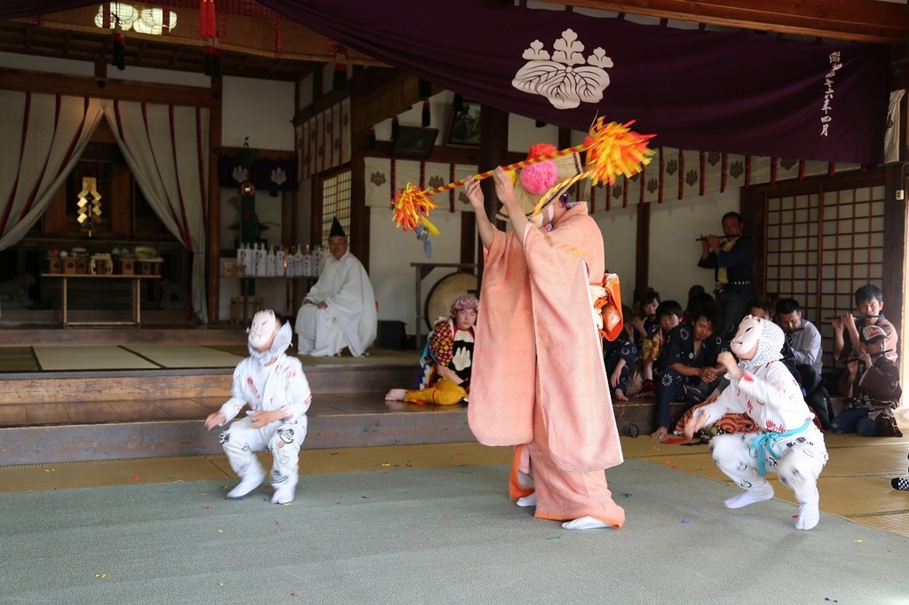 - 例祭の予定(変更になることがあります。)14:00頃~神事 1時間~1時間30分程度15:00頃~獅子舞・狐釣り奉納※渡御行列は行ないません。