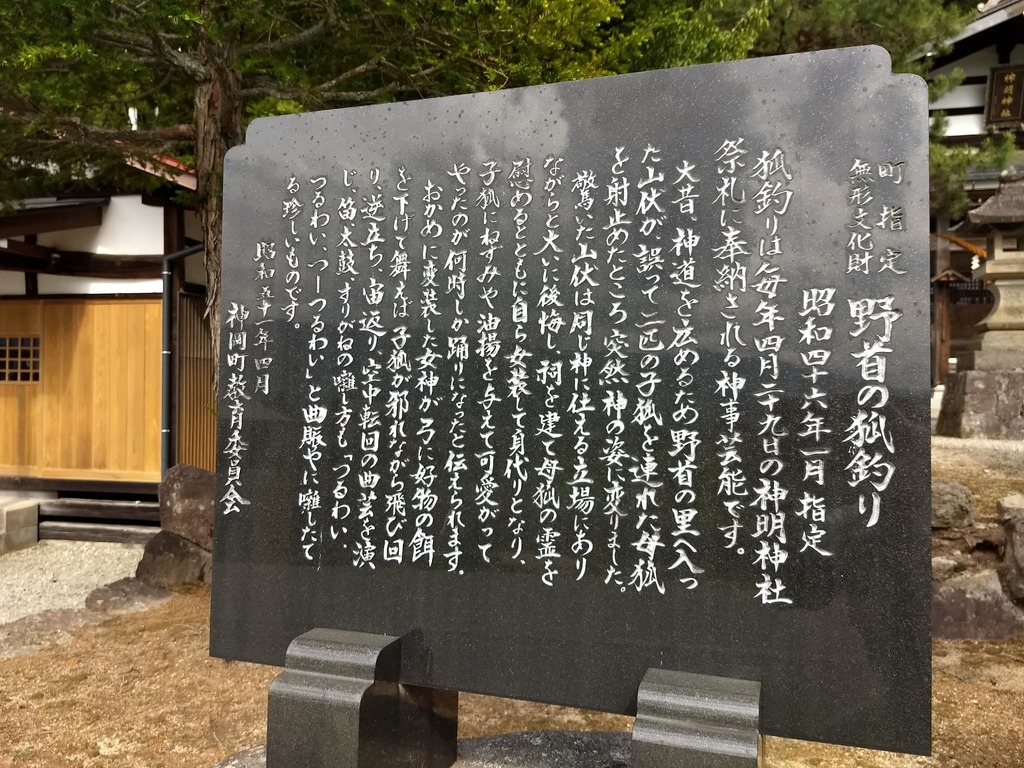 毎年4月29日に開催される野首神明神社の例祭時に奉納される神事芸能「狐釣り(きつねつり)」。