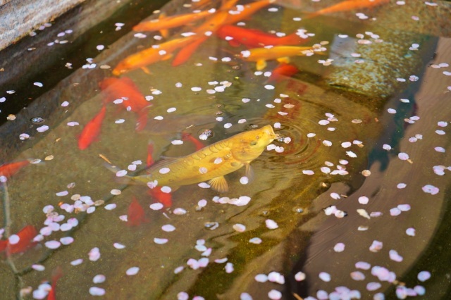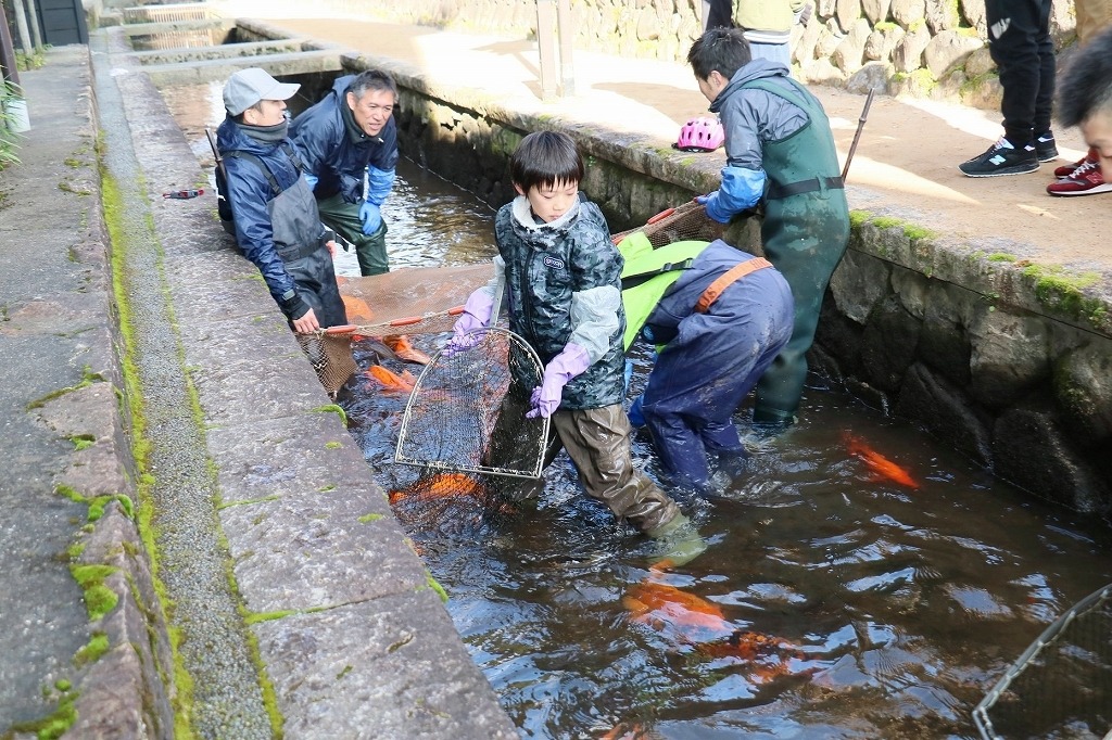 4月上旬、近くのお堀の池で冬を過ごした鯉たちが再び瀬戸川へと戻されます。