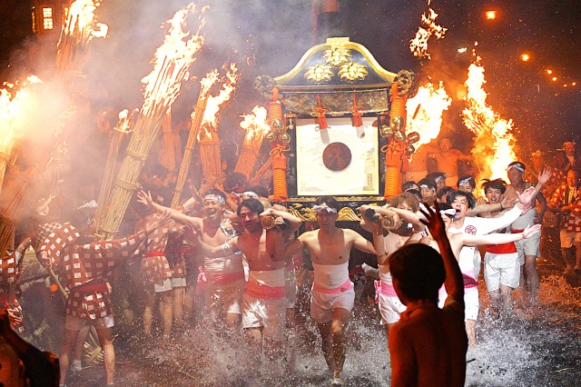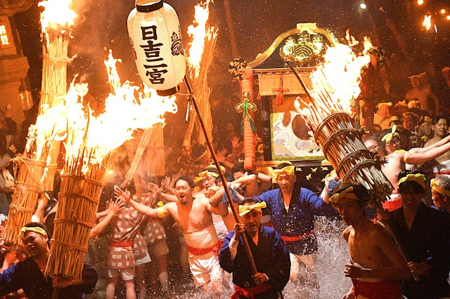 国内でもまれな勇壮、豪快な火まつりで、深夜零時に御拝殿から、七社の神輿が次々と担ぎ出されて、 参道大鳥居前の琵琶湖になぞらえた川をいっきに渡り、お旅所へとお渡りになる神事で、 このとき火まつりは最高潮に達します。