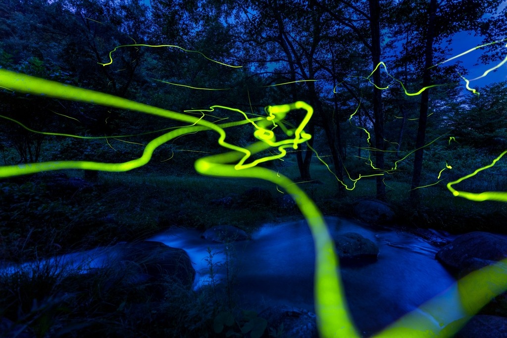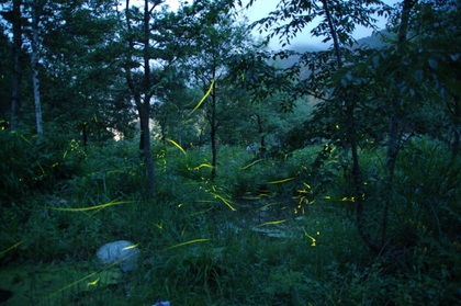 足湯「蛍の湯」から下流に広がる水路や草むらの広範囲にわたってホタルが飛び交います。