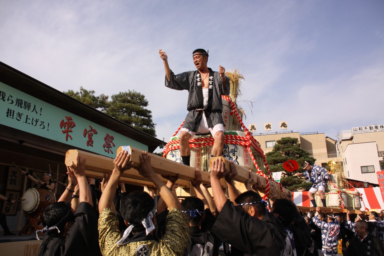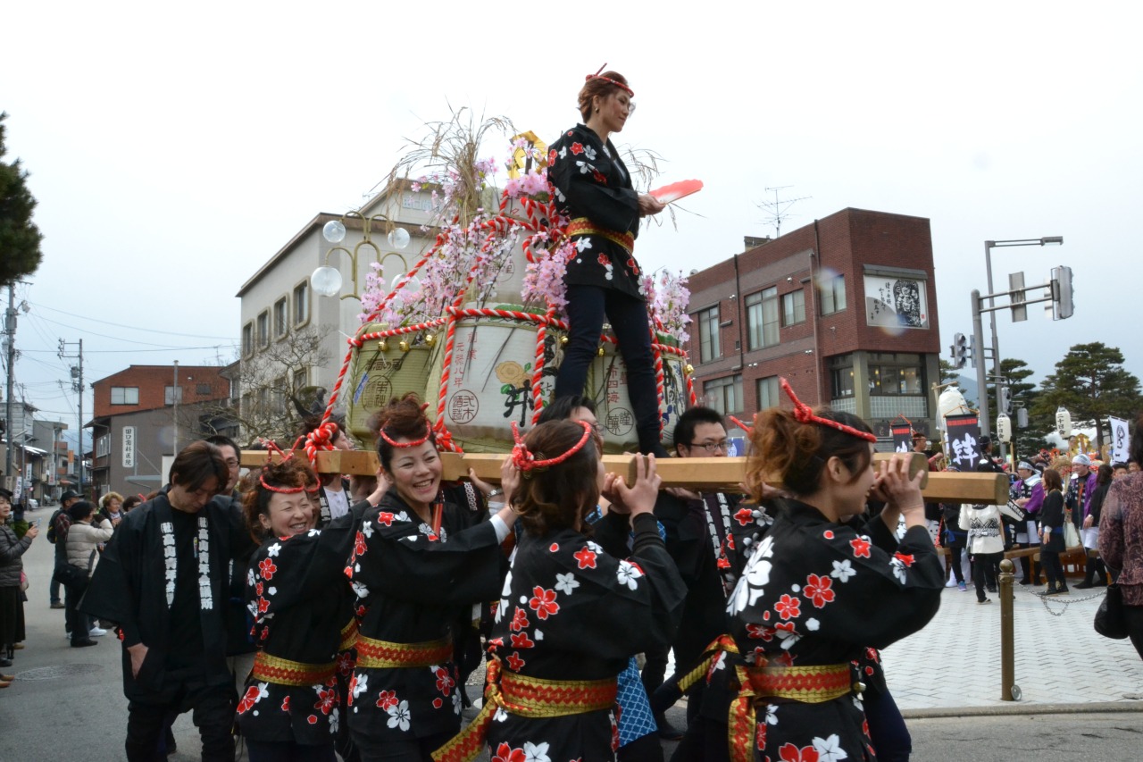 新酒の完成を祝い、五穀豊穣を願い、飛騨の若人が「酒樽神輿」を担ぎます。自分たちで育てた酒米で造ったお酒「神のしずく」を当日限定で販売・振舞います。