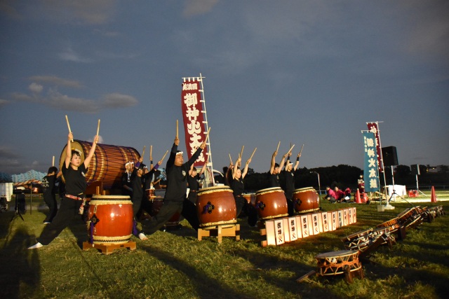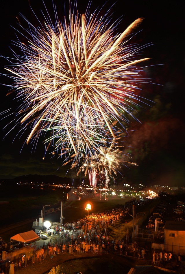 木曽川を背景に、河畔で打ち上げられるバリエーション豊かな花火が夏の夜空を美しく彩ります。フィナーレのスターマイン連続打ち上げや勇壮な和太鼓演奏は迫力満点です。