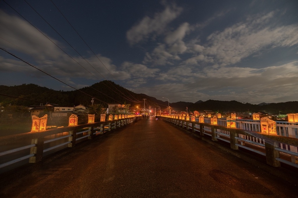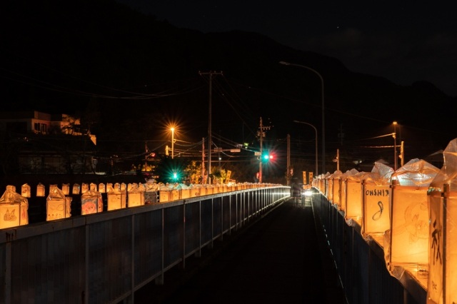 水面や堤防に並ぶ灯ろうが幻想的な世界、雰囲気のなか、スターマインなどの花火も閲覧できます。