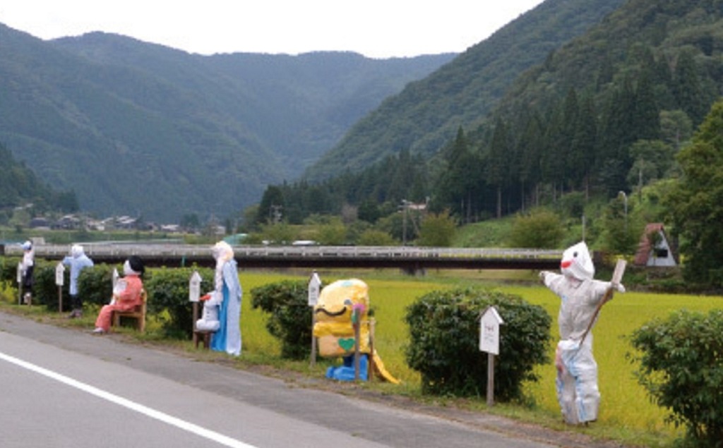 例年9月中旬~10月中旬に地元の人たちの手作りのかかしがずらりと並びます。