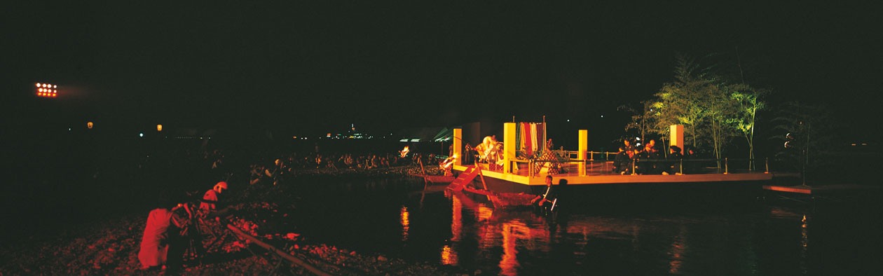夕暮れの時、篝火により浮かび上がる川辺の特設舞台で行われるため大変幻想的な情景の中で薪能を鑑賞することができます。