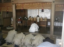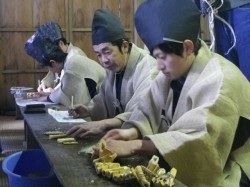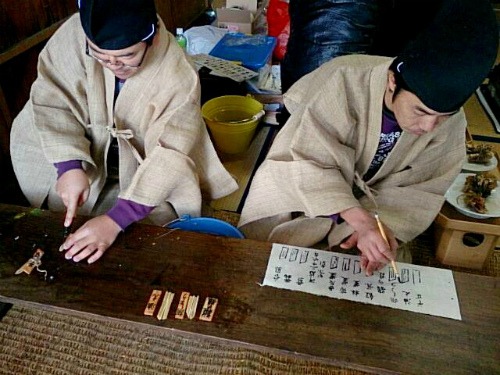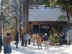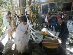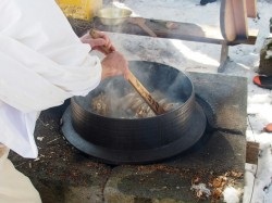 高山市の無形文化財でもある伝統神事。占う項目を書いた木札を麻ガラに付け、粥とともに炊き上げる。麻ガラの中に詰まった粥の入り具合から一年の吉凶を占う。