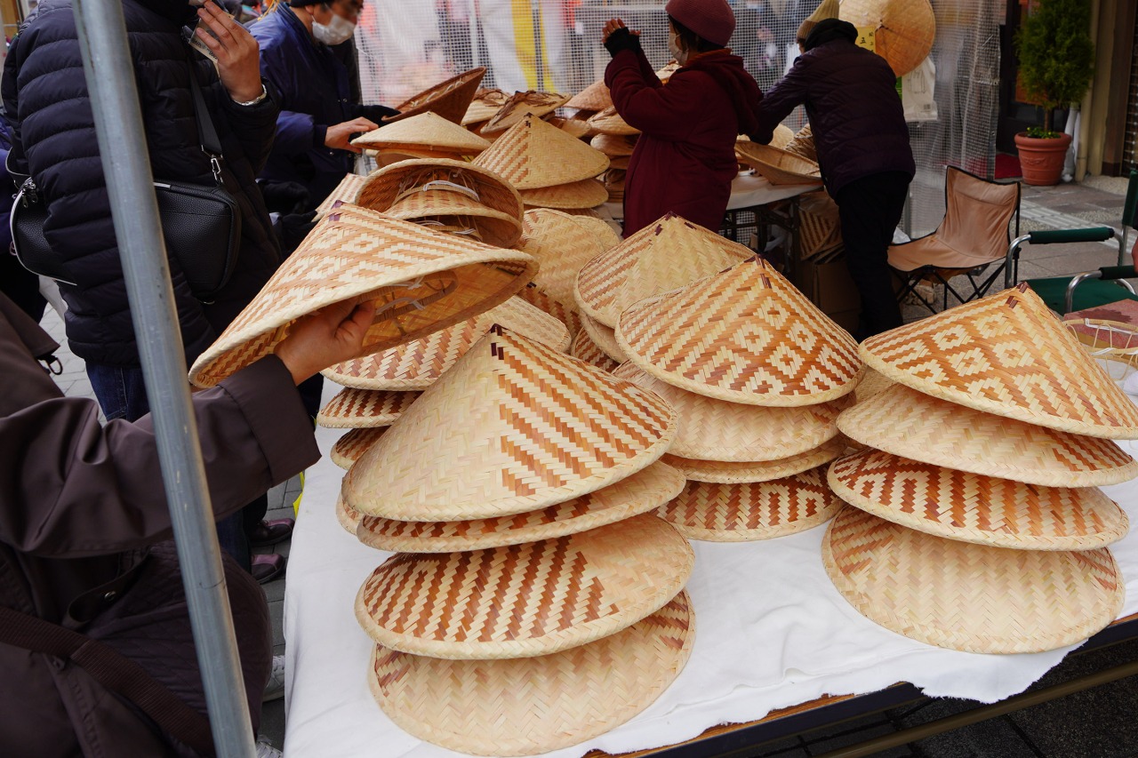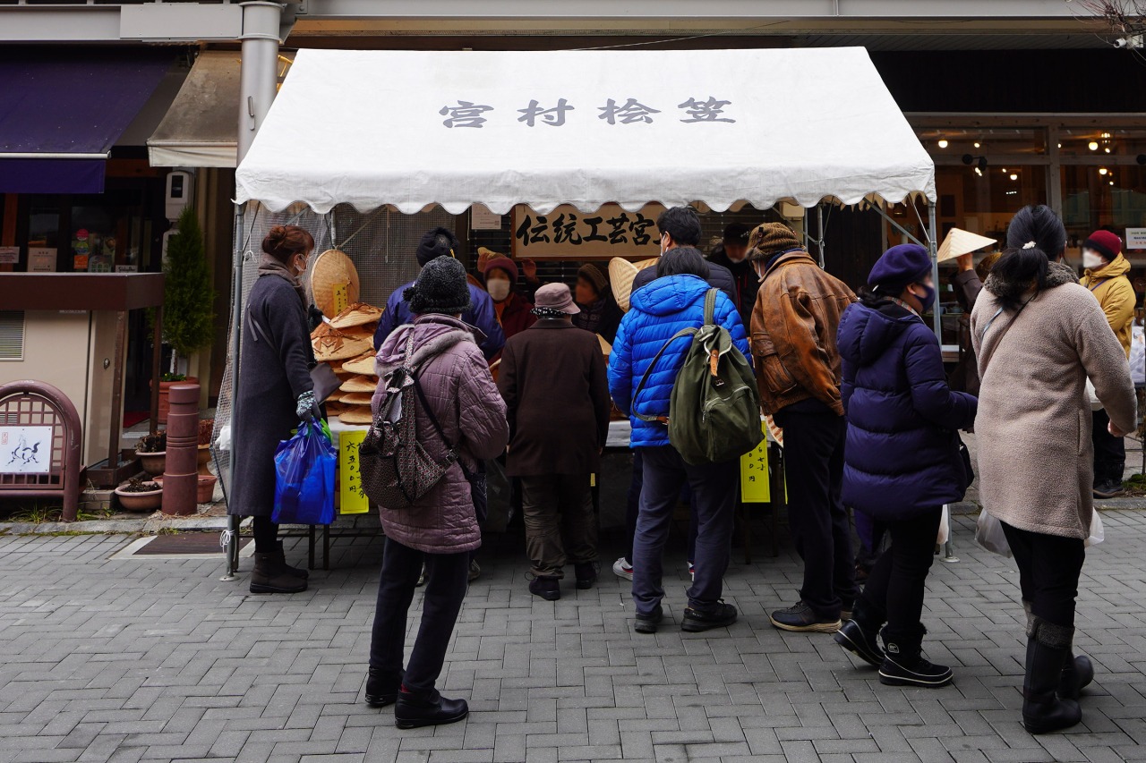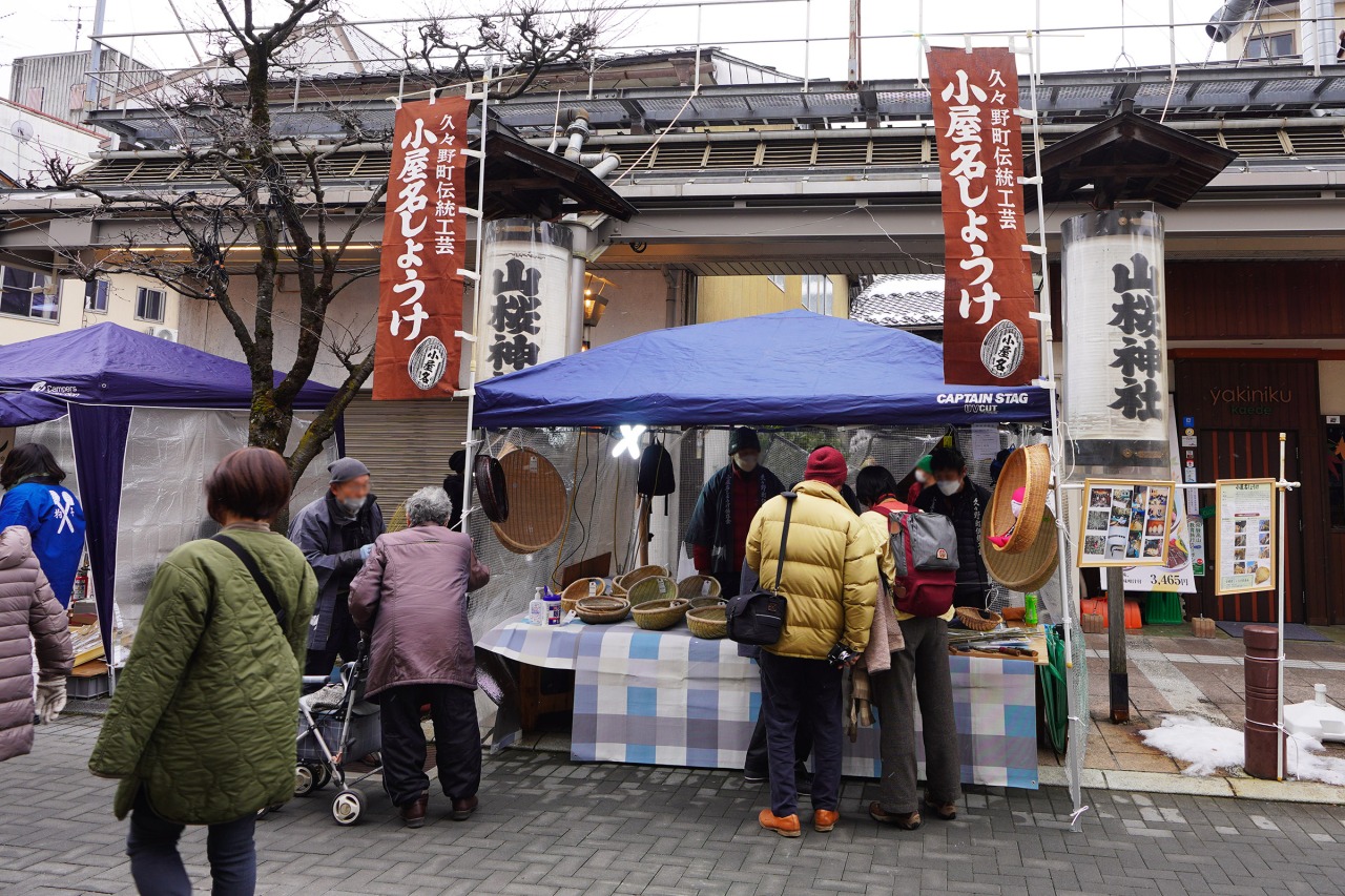 高山市の冬の風物詩、二十四日市は、旧暦時代には十二月二十四日に開かれ、近在農家が農閑期に作った、竹かご、ひ笠(がさ)、まき、炭、むしろ、みのなど手作りした日用品を、町の人に売ったのがはじまりです。現在は中心商店街の本町通りと安川通りで行われ、しょうけ(ざる)や宮笠、有道(うとう)しゃくしなどの民芸品や、地元のグルメなどの露店が並び、毎年大勢の買い物客で賑わいます。