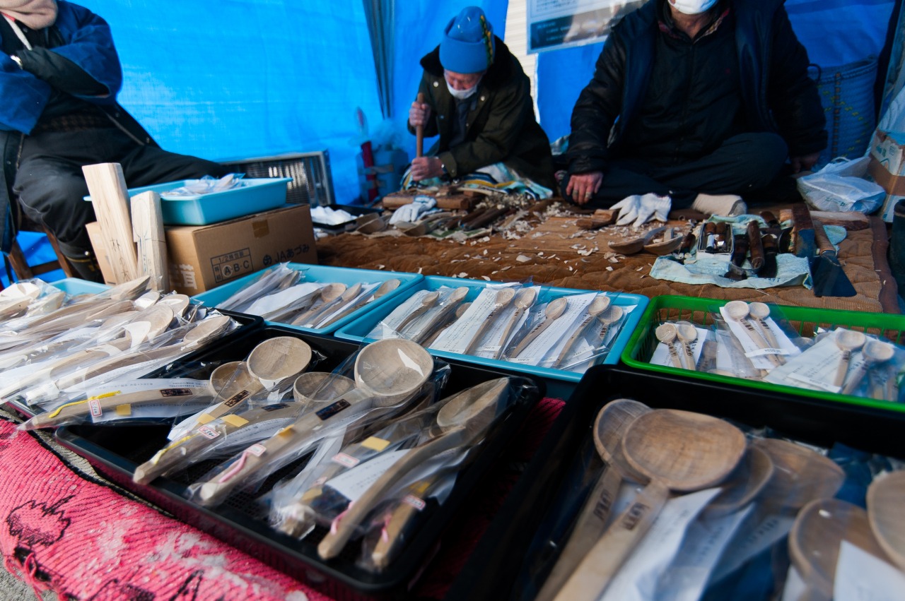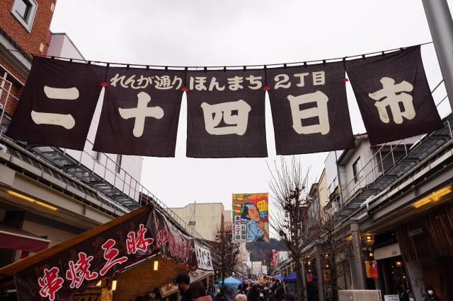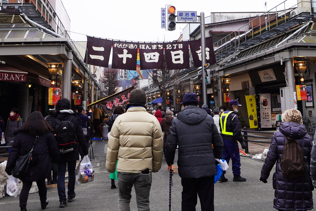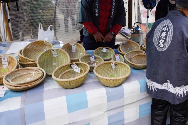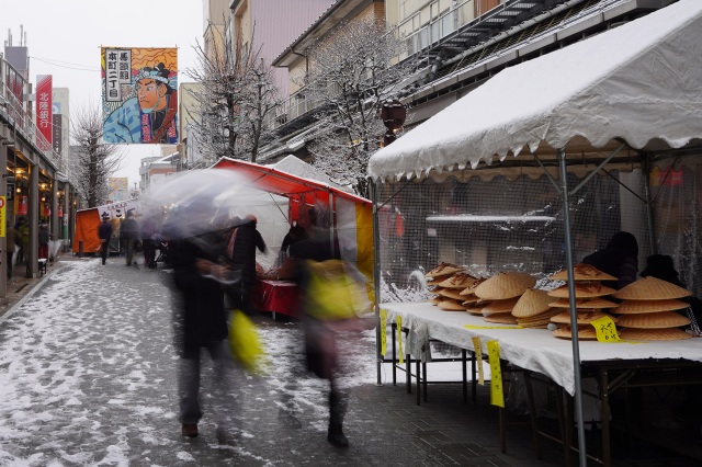 高山市の冬の風物詩、二十四日市は、旧暦時代には十二月二十四日に開かれ、近在農家が農閑期に作った、竹かご、ひ笠(がさ)、まき、炭、むしろ、みのなど手作りした日用品を、町の人に売ったのがはじまりです。現在は中心商店街の本町通りと安川通りで行われ、しょうけ(ざる)や宮笠、有道(うとう)しゃくしなどの民芸品や、地元のグルメなどの露店が並び、毎年大勢の買い物客で賑わいます。