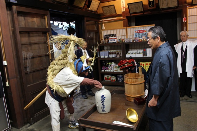 また、江戸時代から伝わる珍しい神事「酒買いの儀式」が行われます。この儀式は、天神様の使者である沛王(はいおう)が獅子を伴い地元の造り酒屋(白扇酒造)へ御神酒を買いに行くというもので、やりとりがすべてパントマイムで行われるユーモラスなもの。この神事は日曜日の早朝6時頃に神社近くの造り酒屋(白扇酒造)で行われます。このやり取りに台詞をつけると、ざっとこんな感じ。
