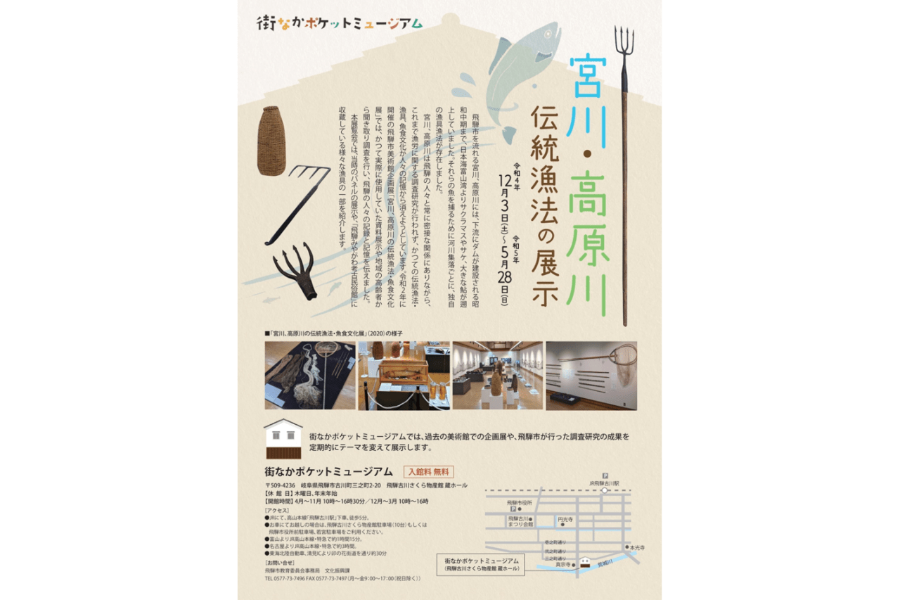 宮川、高原川は飛騨の人々と常に密接な関係にありながら、これまで漁労に関する調査研究が行われず、かつての伝統漁法・漁具、魚食文化が人々の記憶から消えようとしています。令和2年に開催の飛騨市美術館企画展「宮川、高原川の伝統漁法・魚食文化展」では、かつて実際に使用していた資料展示や地域の高齢者から聞き取り調査を行い、飛騨の人々の記録と記憶を伝えました。
