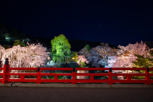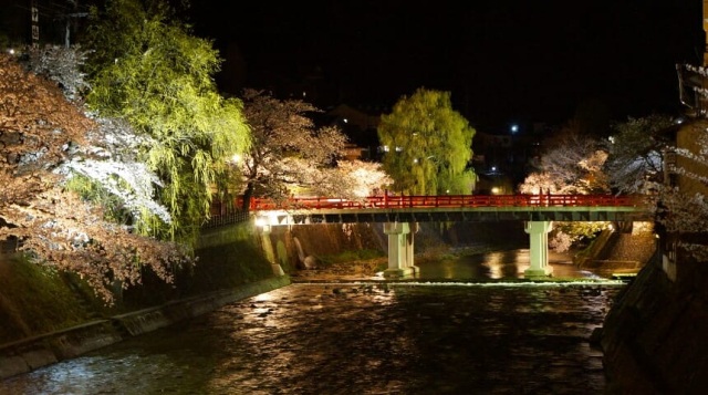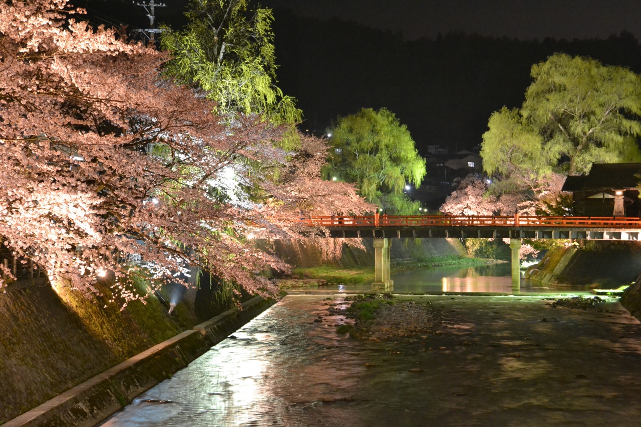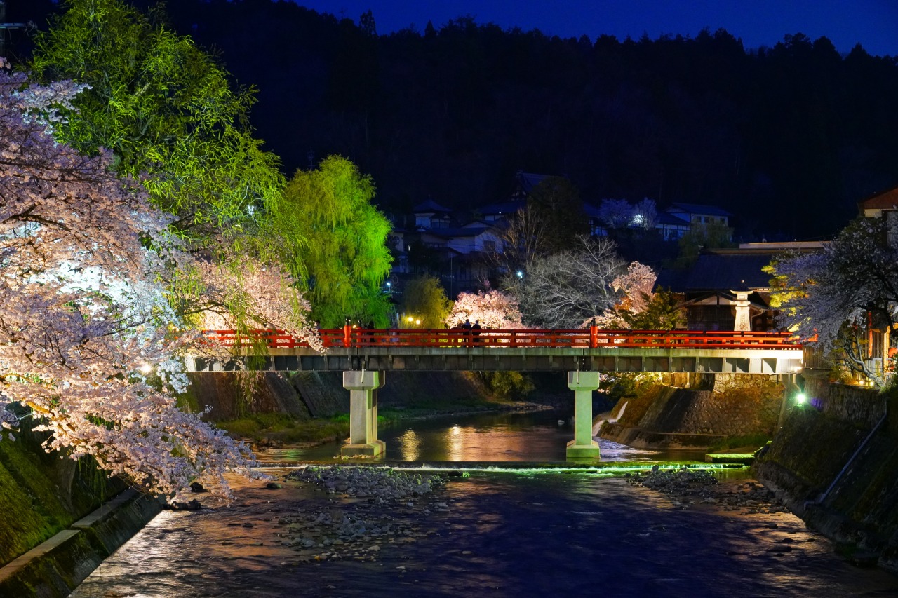 飛騨高山の古い町並みを流れる宮川にかかる赤い橋「中橋」。その鮮やかな朱色は、川の流れにしだれる木々と伝統的な周囲の建物に溶け込み、高山のシンボルの一つとして親しまれています。4/1~5/25の間、この中橋が夜間ライトアップされ、昼間とは異なる幻想的な姿を見ることができます。4/14を除く毎日、時間は18時半~21時半です。ぜひ足を運んでみてください。