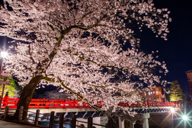4月中旬~下旬: この時期は、中橋周辺の桜が見頃を迎えます。ライトアップされた桜は、夜の闇の中にふわりと浮かび上がり、その淡いピンク色が赤い中橋を優しく包み込みます。水面に映る桜と橋のコントラストは息をのむ美しさで、まるで絵画のような光景が広がります。そよ風に吹かれて舞い散る桜の花びらが、光に照らされながら川面を流れる様子は、言葉では言い表せないほどの風情があります。この時期は特に多くの観光客や地元の人々が訪れ、夜の散策を楽しむ姿が見られます。