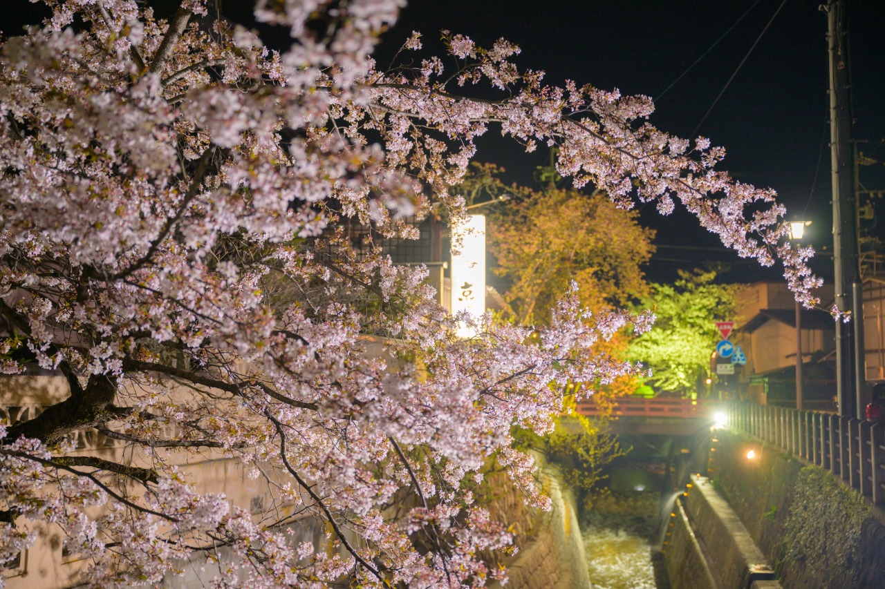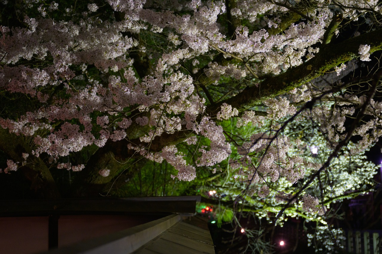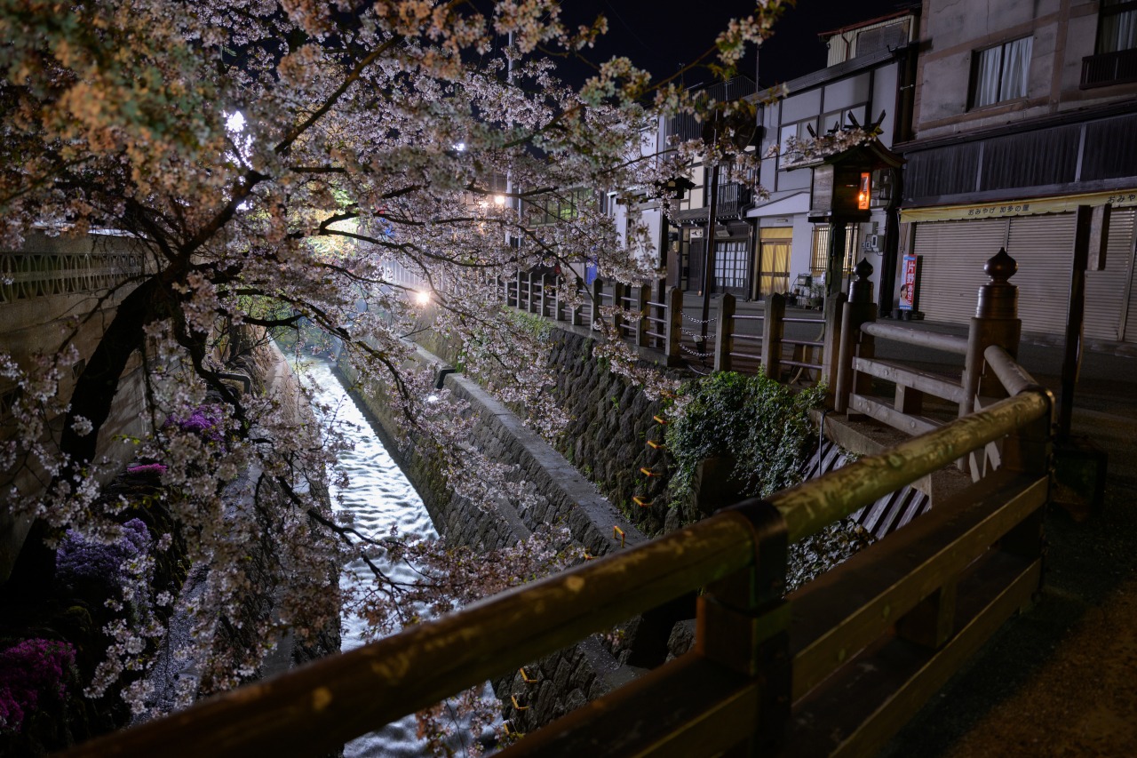 町並みの中を静かに流れる江名子川。川沿いに立ち並ぶ桜や松を優しく照らし、趣ある夜の風景が広がります。カメラ片手に夜の散歩にもおすすめです。