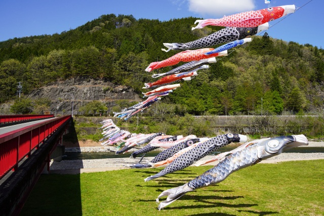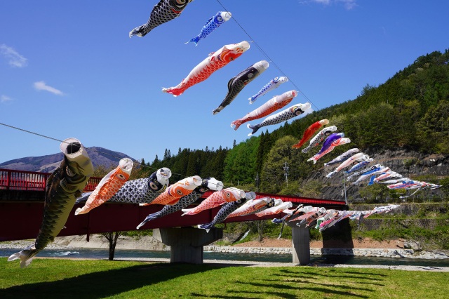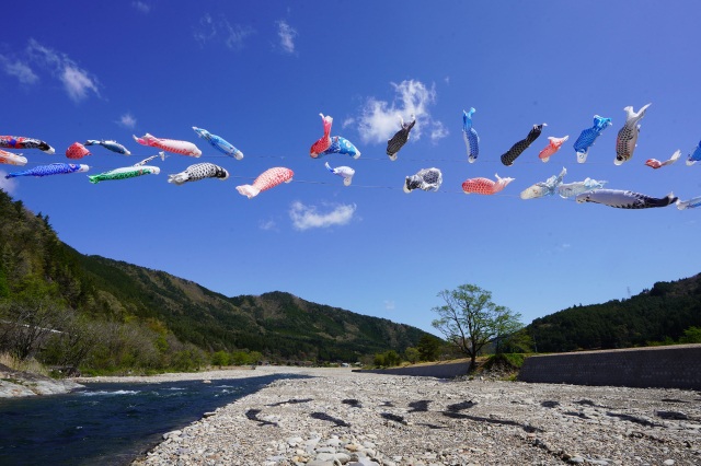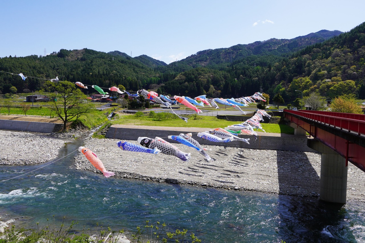 新緑が目に鮮やかな飛騨の山々に抱かれた久々野町。その中心を悠々と流れる飛騨川の上空では、今年もまた、約百匹ものこいのぼりが春風を受け、大空を舞台に優雅な舞を繰り広げています。鮮やかな緋鯉や真鯉、そして様々な色合いの子供たちが、まるで生きているかのように、時に力強く、時にたおやかに空を泳ぐ姿は、見る者の心を晴れやかにします。