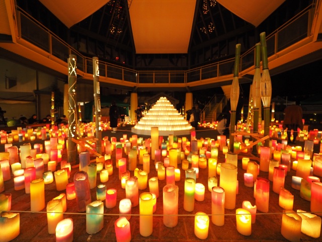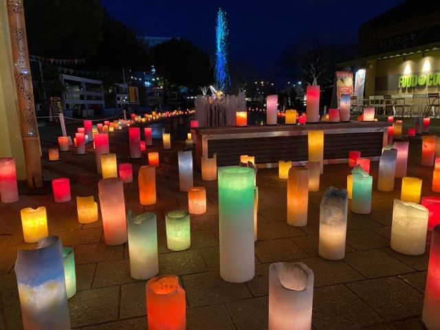 12月の夜には、ガラスドームからにじいろ噴水にかけて「キャンドルナイト」が開催されます。