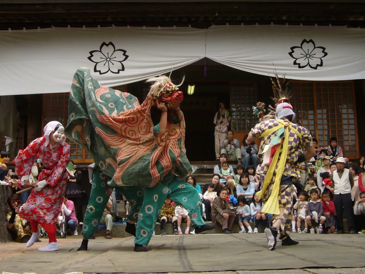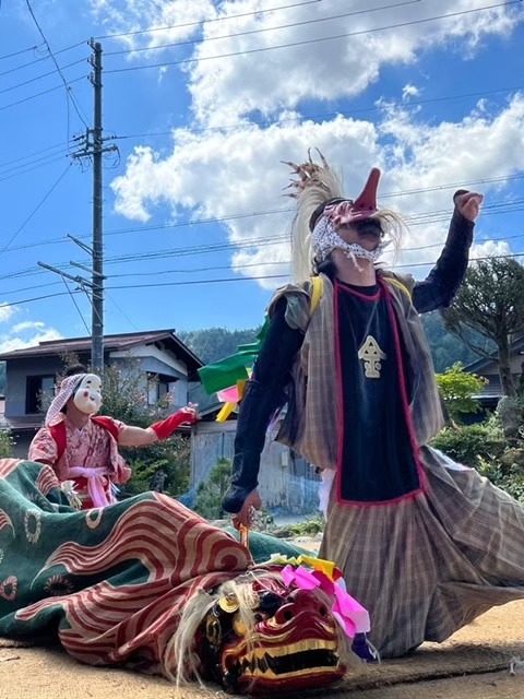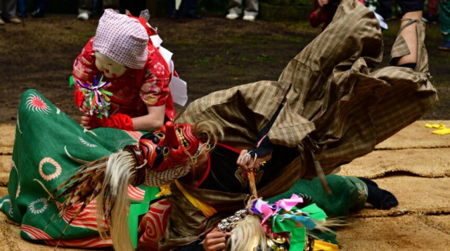 そして、獅子退治の様子を舞踏化し、笛や太鼓、すりこぎの音に合わせて演じる「獅子舞」として、五穀豊穣と家内円満を祈る例祭で今も奉納されている。