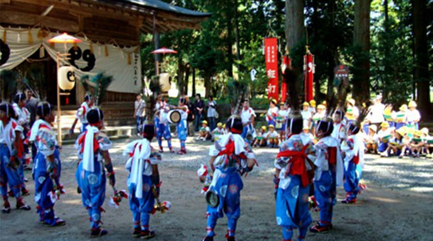 鉦打ちは、14歳くらいまでの子どもたちがおこない、二名が鉦大将として指揮に当たり、以下締め太鼓、鉦打ちとして演技します。「イーコイ」と呼び、四連打の鉦で左右に踊り、その他の鉦で下打、回転、移動をするよう工夫されたもので、荒城神社独自の楽曲です。
