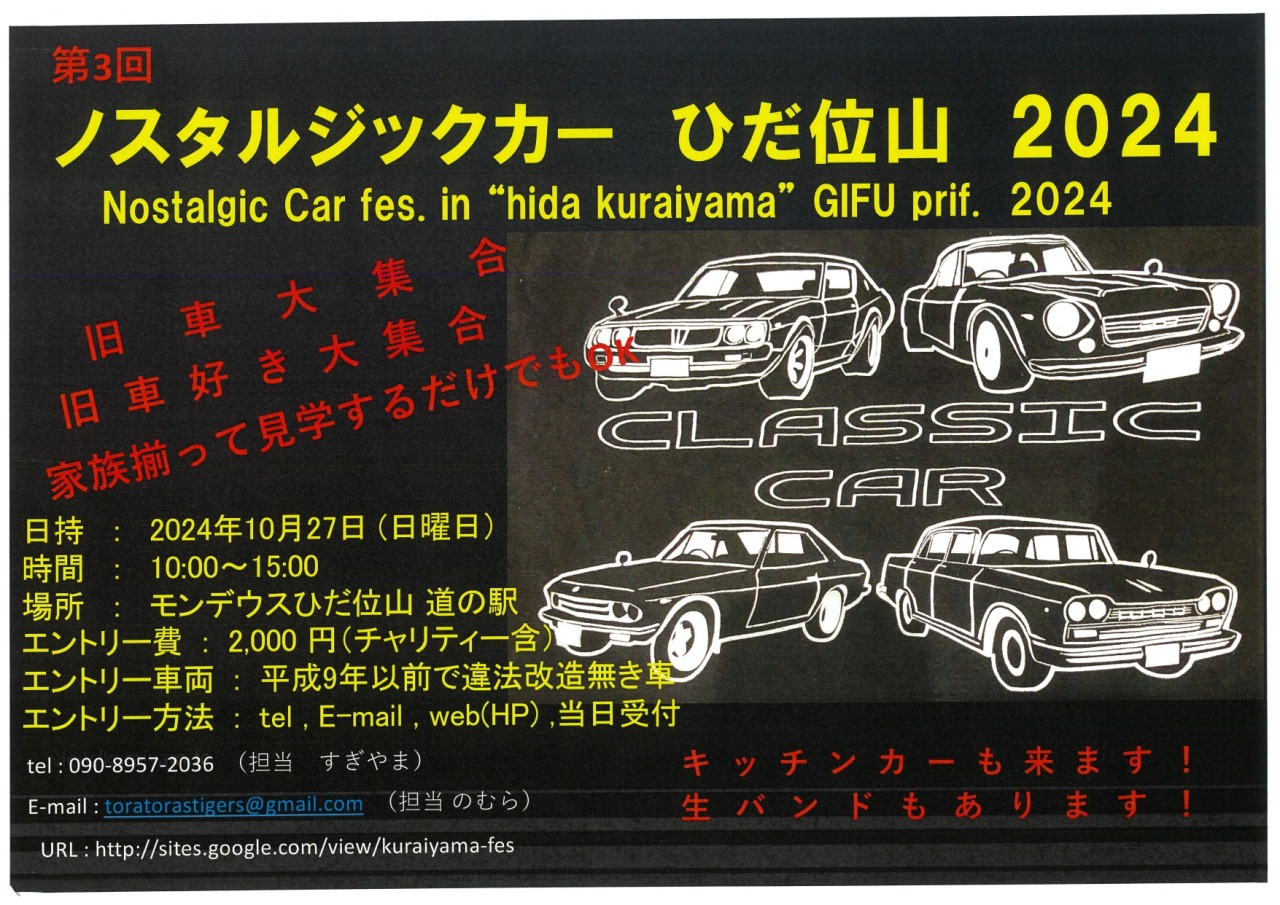 「第3回ノスタルジックカーひだ位山2024」が今年もモンデウスひだ位山で開催されます。第2回の昨年は120台の旧車エントリーがあり、ご来場はなんと2,000人以上!今年は生バンド演奏、キッチンカー、ラジコンカーの大会、旧車への体験試乗があり、更にパワーアップ!旧車ファン垂涎のハコスカGTRや2000GTが見られるかも?位山に響き渡る爆音をぜひ体感してください!