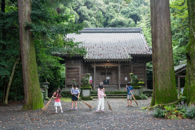 8世紀創建の古い神社の境内にある古民家貸別荘で、かまどを用いての自炊、五右衛門風呂、境内の掃除や草抜きなどの活動をとおして昔ながらの田舎の暮らしぶりを体験します。