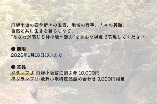 飛騨小坂の四季折々の風景、地域の行事、人々の笑顔、自然と共に生きる暮らしなど、“あなたが感じる飛騨小坂の魅力”を自由な視点で表現してください。