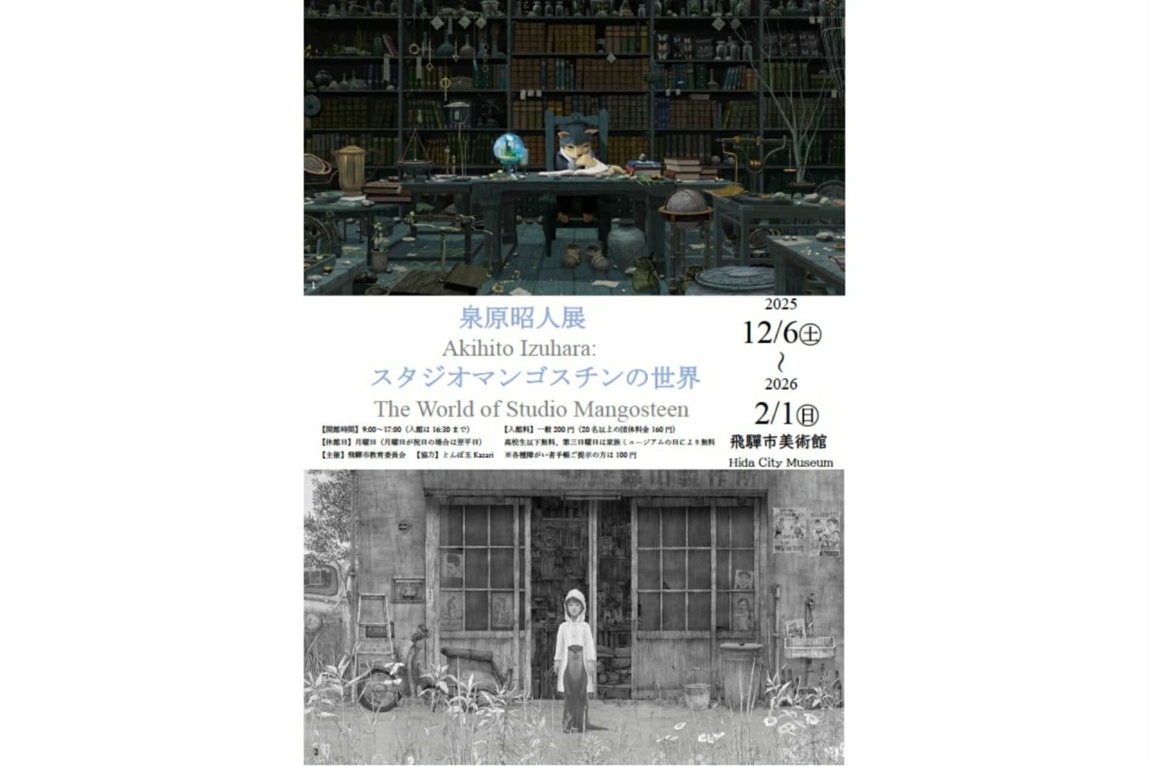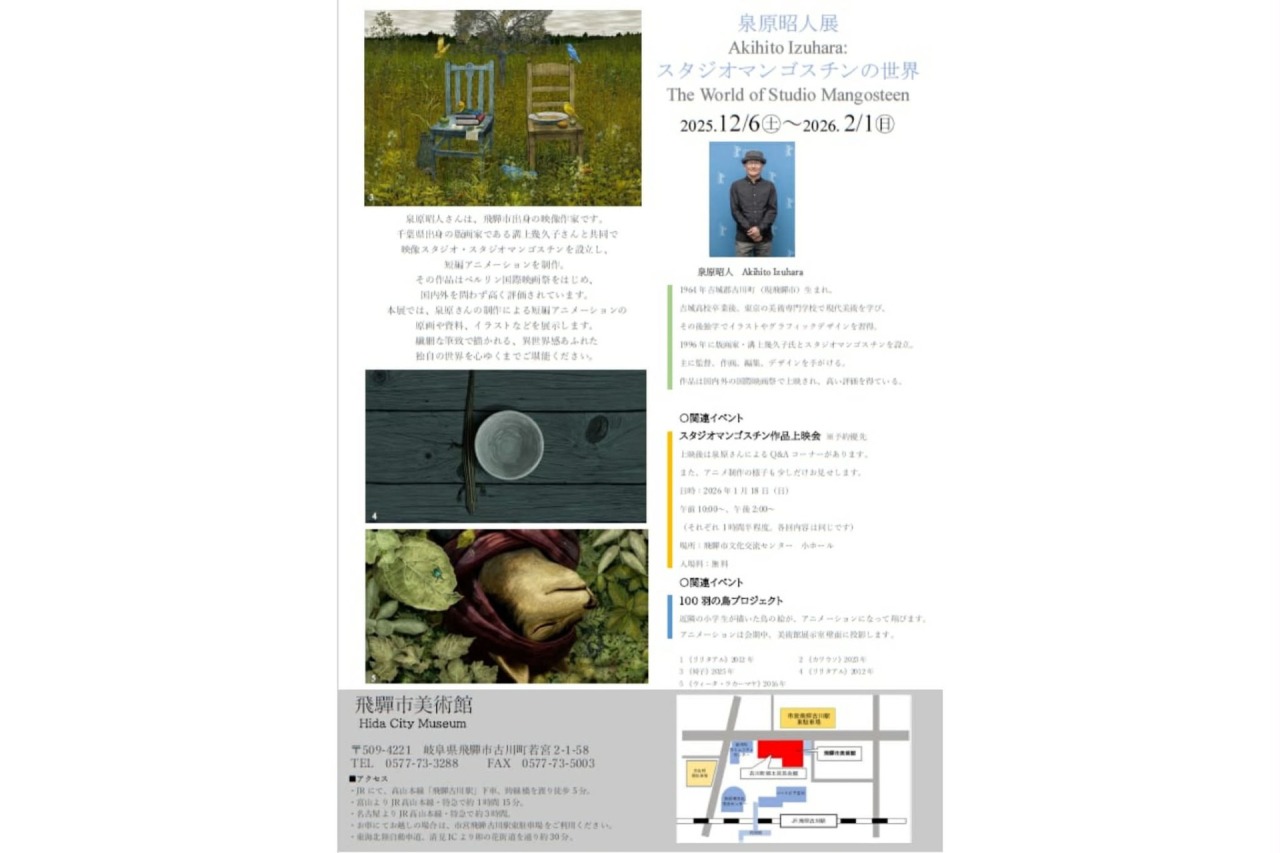 12月6日(土曜日)より開催予定の「泉原昭人展-スタジオマンゴスチンの世界-」に合わせ、泉原さんが版画家・溝上幾久子さんと共同で設立した映像スタジオ・スタジオマンゴスチンの短編アニメーション作品を一挙上映します。近隣の小学生が描いた絵を基に、泉原さんが新たに制作したアニメーション「100羽の鳥」も、音声付きのフルバージョンで特別上映します。