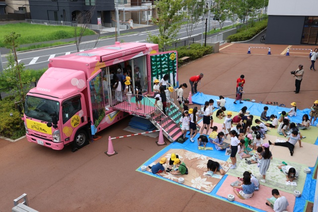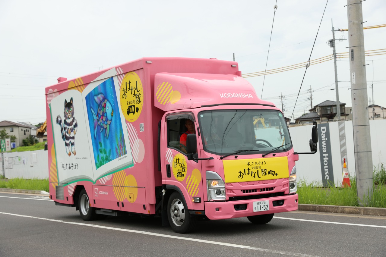 絵本をたくさん積んだトラックが、森のぬくもりあふれるウッドフォーラム飛騨に登場します。