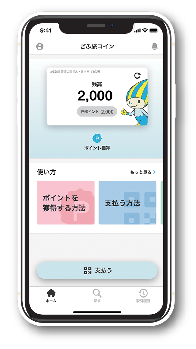 お土産の購入や飲食等に使用できる電子観光クーポン(電子ポイント)です。 - スマートフォンの「ぎふ旅コイン」アプリを使用します。
