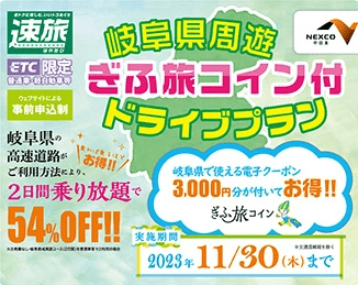岐阜県内の高速道路が定額で乗り放題となる「高速道路周遊パス」と「ぎふ旅コイン」がセットになったプランです。