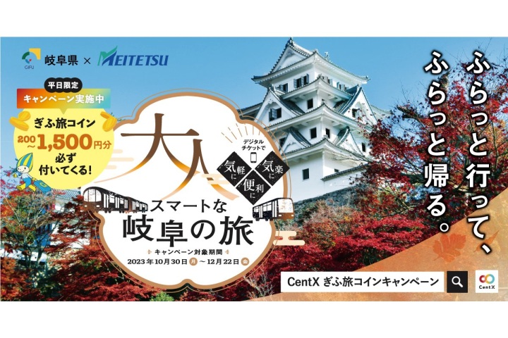 名古屋鉄道のスマートフォンアプリ『CentX』から岐阜県内の「鉄道やバスの乗車券」と電子観光クーポン「ぎふ旅コイン」がセットになった商品を販売いたします。