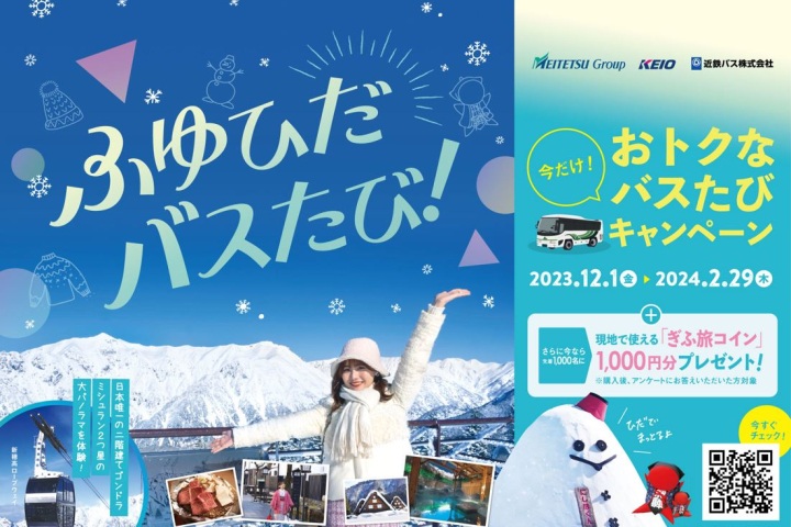 県内を含む周遊エリアの「高速道路周遊パス」と、県内の観光施設などでご利用できる電子観光クーポン「ぎふ旅コイン」をセットにした「速旅『ぎふ旅コイン付ドライブプラン2025』」です。