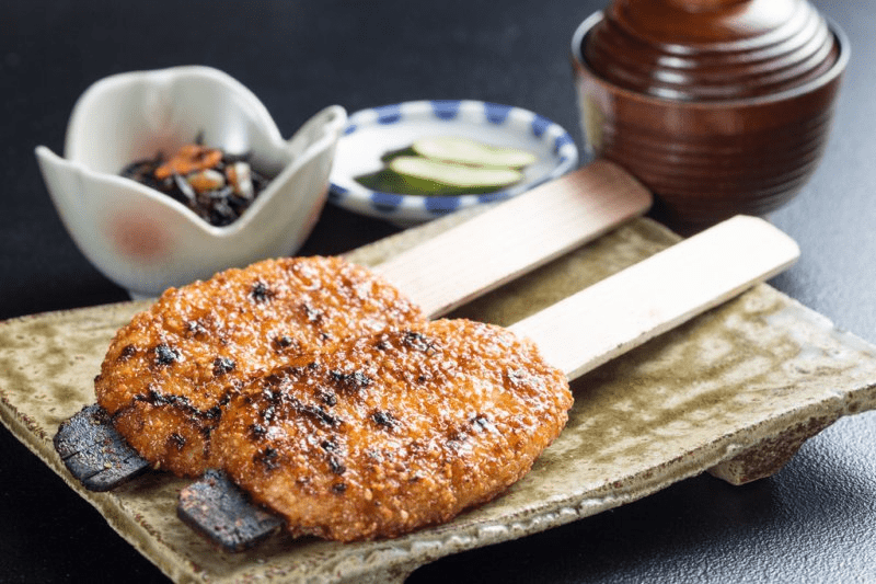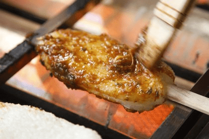 串を通したご飯のかたまりを遠火で下焼きし、タレをつけてこんがり焼いた五平餅。恵那、中津川地域ではお客さんをもてなす最大のご馳走でした。