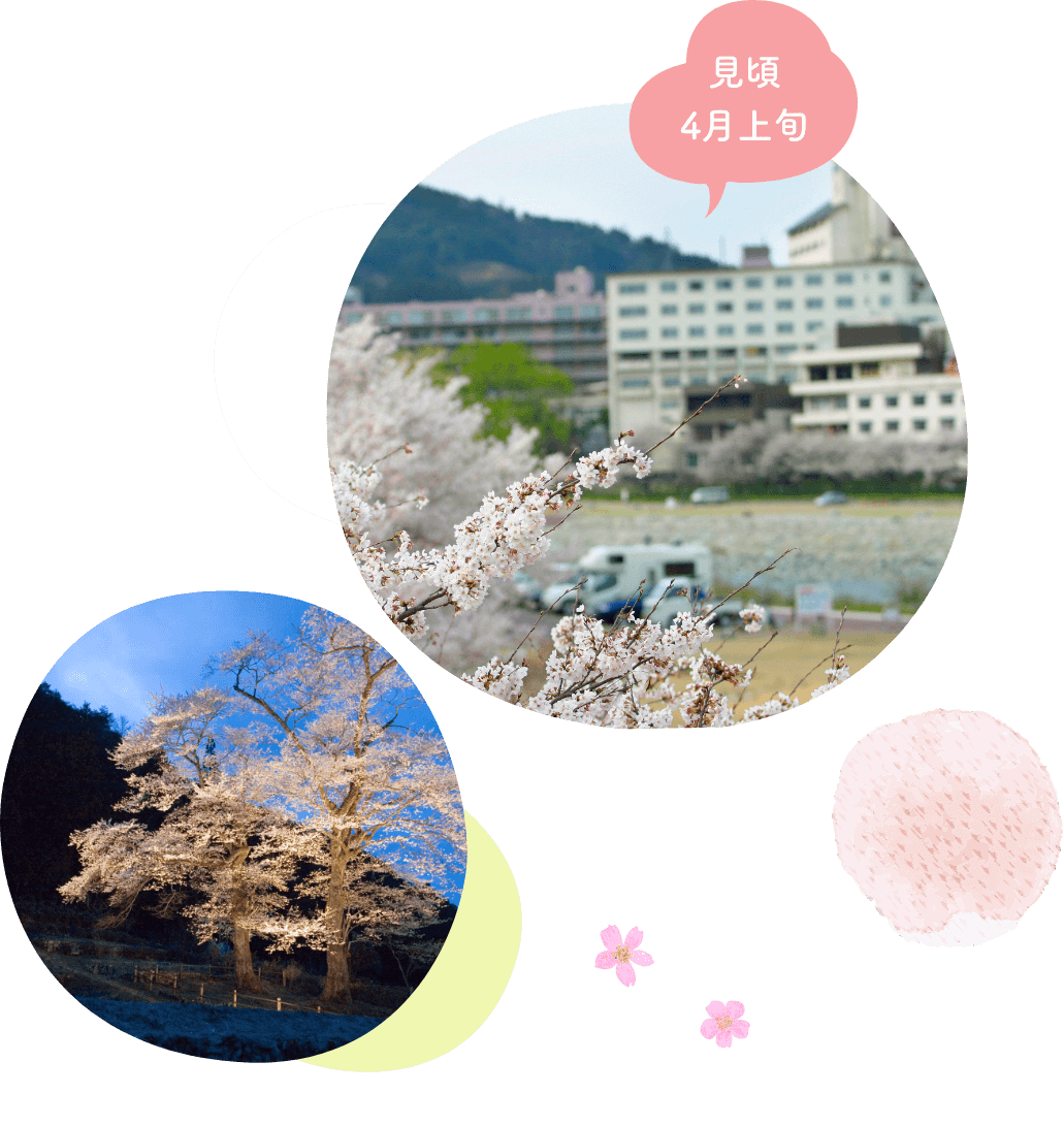 下呂市の和佐地区、大和橋を渡った小丘に2本が寄り添うように立っています。樹齢約400年以上といわれ、樹勢は今なお盛んです。もちろん下呂温泉街でも桜を楽しむことができます。