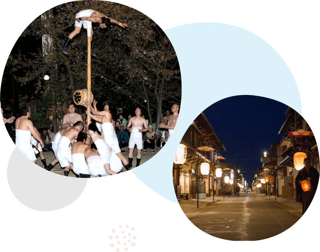 からくり奉納や獅子舞、闘鶏楽とともに進む御巡幸(祭行列)は必見。14日のみ行われる夜祭では、提灯の灯りに照らされた屋台が高山の町へと曳かれていきます。