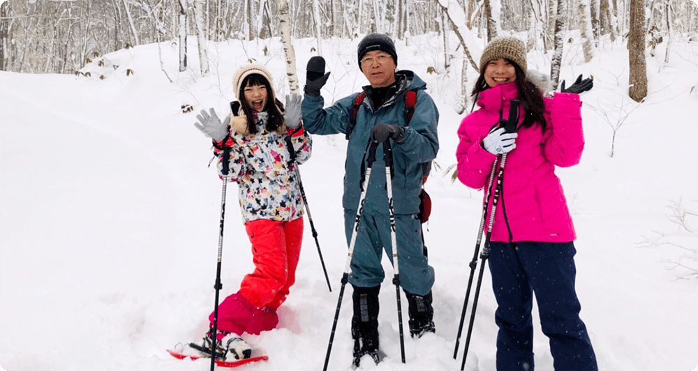 スノーシューをはいて、ふわふわで白銀の世界へ。草木が生い茂る森の中も、雪の上を歩いて入れます。