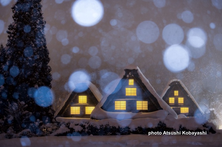 合掌造りの屋根や、あたり一面に降り積もる雪が光に映し出され、幻想的な光景。