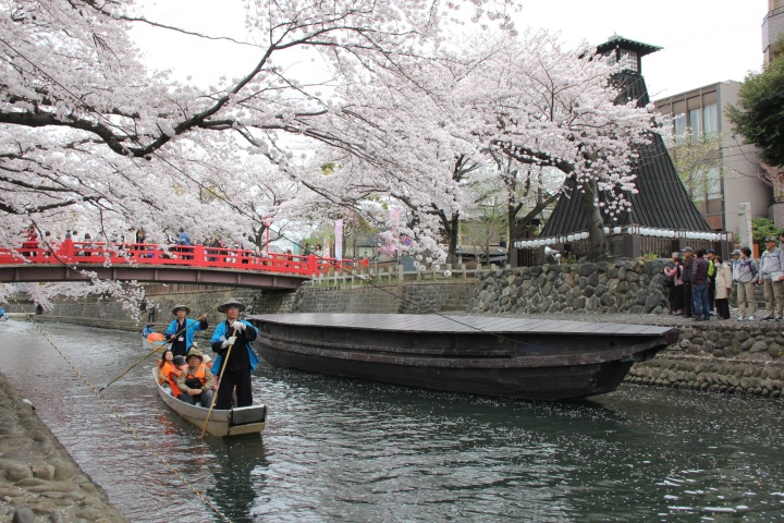 水の都と呼ばれる大垣の春を満喫できる舟下り。 水門川沿いの約100本の桜を眺めながら約30分かけてゆったりと川下り。