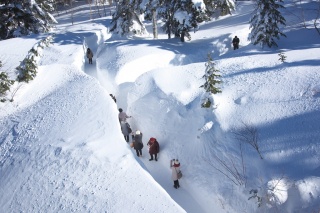 新穂高ロープウェイ西穂高口駅・千石園地に「雪の回廊」が出現!その高さはなんと3m!! 標高2,156mに降り積もる雪の迫力を、そして周囲が全て”白”の、美しくも不思議な世界を是非体感してください。 体験後は、西穂高口駅4階の「マウントビュー」のホットなメニューであたたまりましょう。